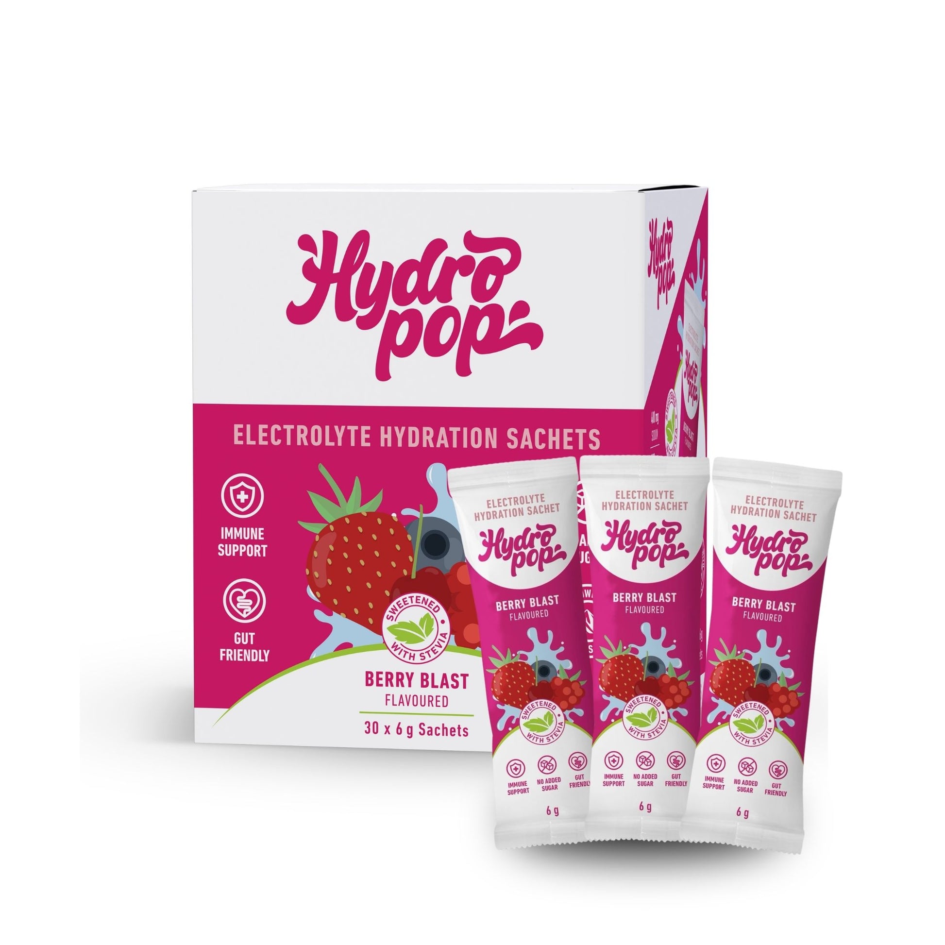 Hydropop Berry Blast is a fruity, powerhouse daily electrolyte drink designed to keep you performing at your peak. Packed with essential vitamins, minerals and electrolytes, each 6 g sachet helps replenish what your body loses through sweat and supports energy, recovery, and overall wellness, without added sugar.